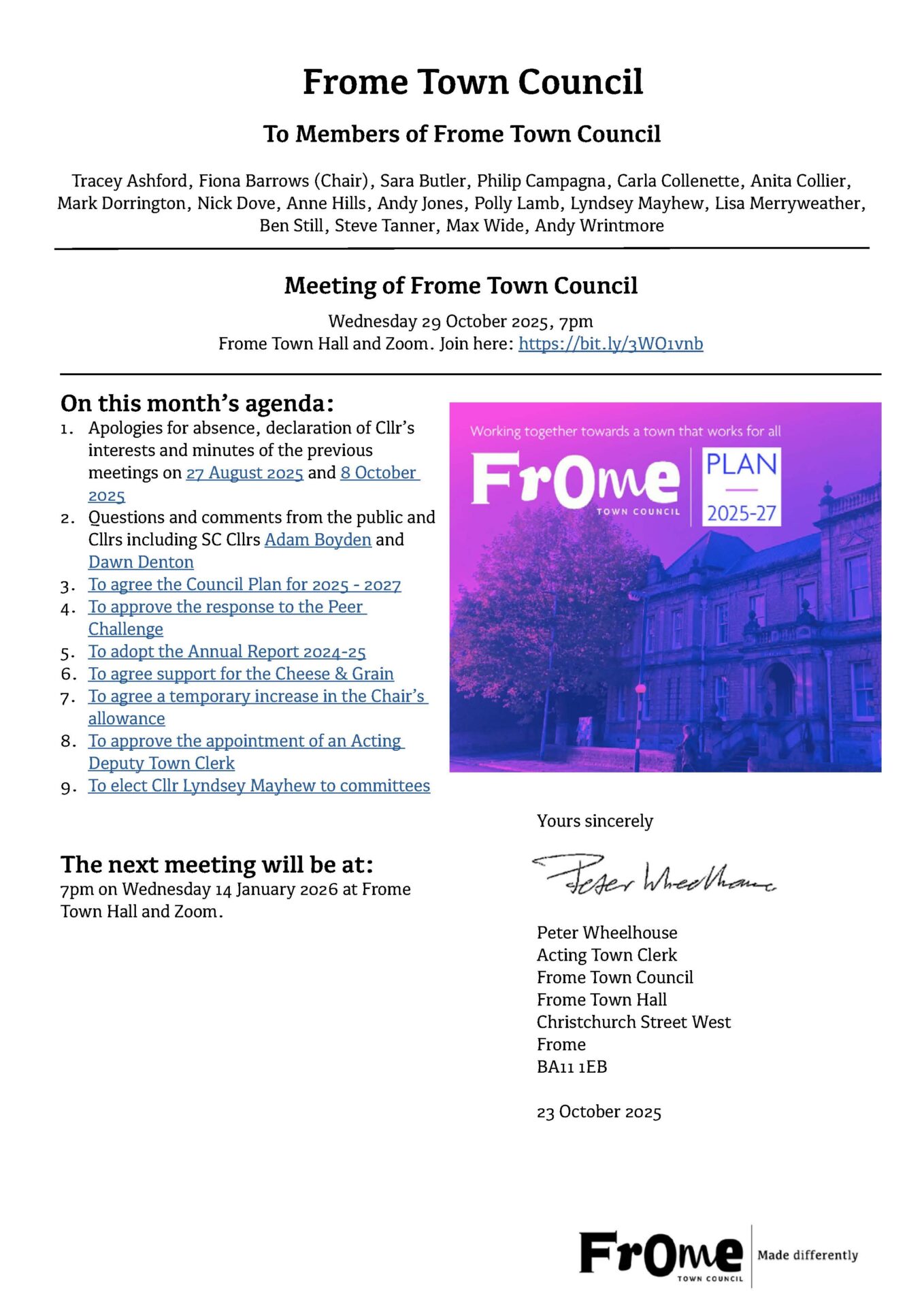 Summons and agenda Council 29 October 2025 Draft minutes Council 27 August 2025 Draft minutes extraordinary Council 8 October 2025 Cllr Adam Boyden FTC Report October 2025 Cllr Dawn Denton FTC Report October 2025 Agenda item 3 For decision – Council Plan 2025-27 Agenda item 4 For decision – Response to Peer Challenge Agenda item 5 For decision – adopt the Annual Report 24-25 Agenda item 6 For update and decision – support for Cheese & Grain Agenda item 7 For decision – increase in chair’s allowance Agenda item 8 For decision – appointment of Acting Deputy Town Clerk Agenda item 9 For decision – election of Cllr Lyndsey Mayhew to committees