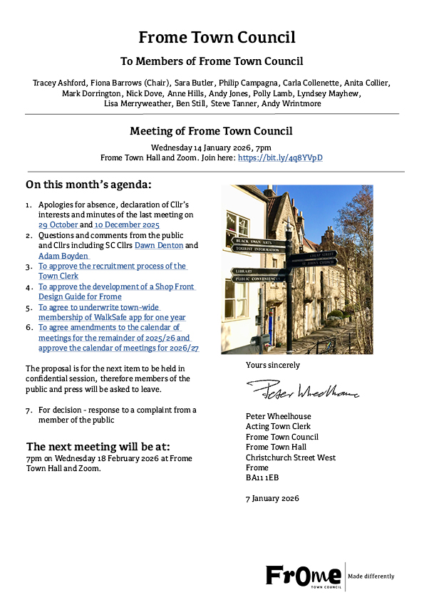 Summons and agenda Council 14 January 2026 Draft minutes Council 29 October 2025 Draft minutes extraordinary Council 10 December 2025 Cllr Dawn Denton FTC Report January 2026 Cllr Adam Boyden FTC Report January 2026 Agenda item 3 For decision – recruitment of the Town Clerk Agenda item 4 For decision – Shop Front Design Guide Agenda item 5 For decision – to underwrite town wide membership of WalkSafe app Agenda item 6 For decision – Calendar of meetings 2026-27 and amendments to meetings from the remainder of 2025-26 Approved minutes Council 14 January 2026