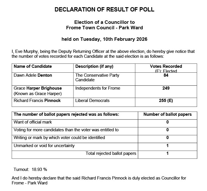 Leader and Chair of Frome Town Council Fiona Barrows said “We congratulate Richard on his election and look forward to working constructively with him for the benefit of Park Ward and Frome as a whole.”